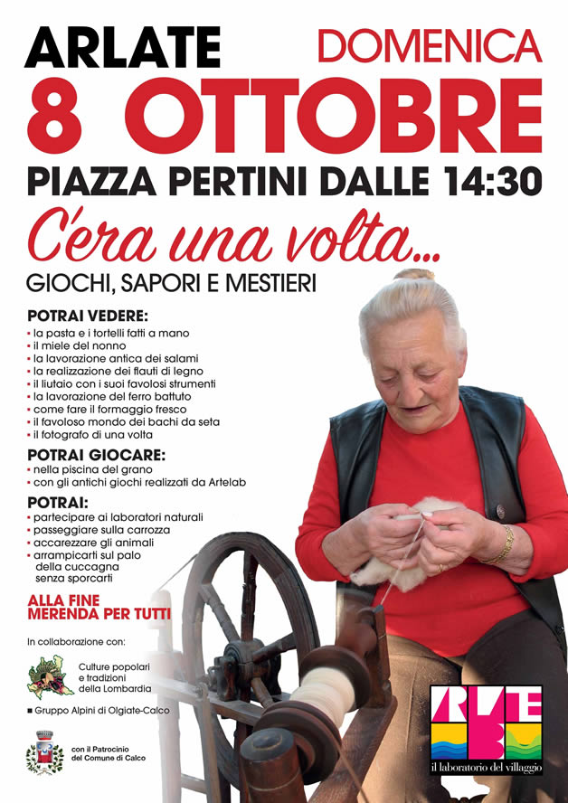 Nel pomeriggio di domenica 8 ottobre, la piazza Pertini di Arlate ospiterà un nuovo evento di Artelab dedicato alle tradizioni del passato. A partire dalle 14.30 incomincierà infatto l'evento ''C'era una volta''. Ci saranno dimostrazioni dei mestieri di una volta, dei giochi di una volta, e poi laboratori e merenda per tutti. L'evento è partocinato dal Comune di Calco in collaborazione con gli Alpini di Olgiate-Calco e l'associazione Culture popolari e tradizioni della lombardia.