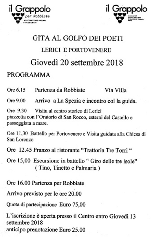L'associazione ''Il Grappolo'' di Robbiate invita per la giornata di giovedì 20 settembre ad una gita al Golfo dei poeti, tra Lerici e Portovenere. Sono aperte le iscrizioni, da effettuarsi entro il prossimo 13 settembre in Villa Concordia. Il costo è di 75 euro. Da lì partirà la gita alle 6.15 con arrivo a La Spezia alle 9, dove il gruppo incontrerà la guida.