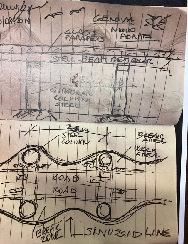 "Tutto è nato dall'emozione che mi ha colpito, come tante persone, dopo aver visto il crollo del ponte che è sempre un fallimento per un ingegnere" ha raccontato "ho fatto una riflessione sull'accaduto e poi mi sono messo a lavorare sulla rivisitazione dell'aspetto strutturale. Il mio intento è stato quello di creare un ponte resistente come quelli che costruivano i romani, appoggiati su piloni solidi. 43 uno per ogni vittima. Lo immagino come un ultimo atto di amore delle vittime che si congiungono per sostenere il ponte con le loro mani".