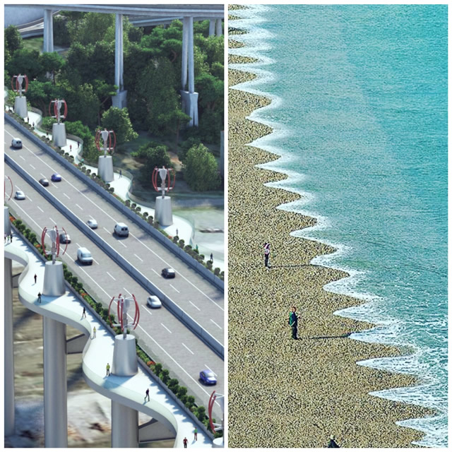 Le onde sulla battigia riprodotte nel camminamento del ponte