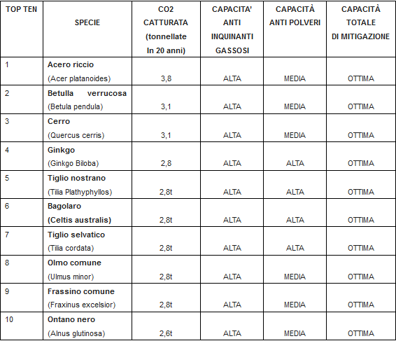 Di fronte all’evidente cambiamento del clima in atto – sostiene la Coldiretti – non si può continuare a rincorrere le emergenze, ma bisogna intervenire in modo strutturale favorendo nelle città la diffusione del verde pubblico e privato che concorre a combattere le polveri sottili e gli inquinanti gassosi. In particolare – spiega la Coldiretti – al vertice della prima top ten delle piante in grado di catturare quasi 4000 chili di anidride carbonica (CO2) nell’arco di vent’anni di vita, bloccando anche le pericolose polveri sottili PM10 e abbassando la temperatura dell’ambiente circostante, troviamo l’Acero Riccio: ogni esemplare è in grado di assorbire fino a 3800 chili di CO2 in vent’anni e ha un’ottima capacità complessiva di mitigazione dell’inquinamento. A pari merito, con 3100 chili di CO2 aspirate dall’aria, ci sono poi la Betulla verrucosa e il Cerro. Catturano fino a 2,8 tonnellate di CO2 in un ventennio il Ginkgo Biloba, il Tiglio nostrano, il Bagolaro, il Tiglio selvatico, l’Olmo comune e il Frassino Comune. L’Ontano nero, con 2,6 tonnellate, chiude la top ten delle piante mangia smog elaborata dalla Coldiretti su dati CNR.