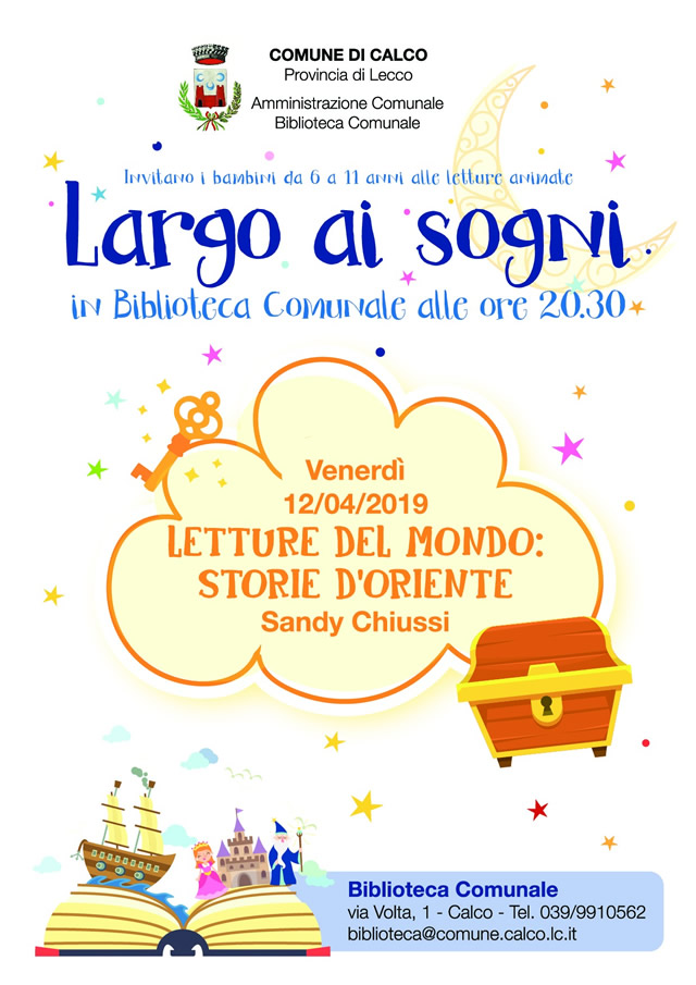 Tornano gli appuntamenti con la biblioteca comunale di Calco. Venerdì 12 aprile, alle 20.30, verrà ospitato un nuovo appuntamento di ''Largo ai sogni'', iniziativa pensata per bambini dai 6 agli 11 anni, con ''Letture del mondo: storie d'oriente'' insieme a Sandy Chiussi. Per informazioni 039.9910562 oppure biblioteca@comune.calco.lc.it.