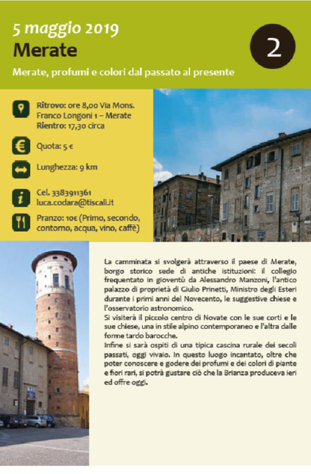 La Pro Loco Merate organizza nell'ambito di Sei in Brianza, il 5 maggio, una camminata attraverso la parte storica della città visitando il Collegio frequentato da Alessandro Manzoni, palazzo Prinetti e le suggestive chiese della città. Si visiterà inoltre il piccolo centro di Novate con le sue corti e i suoi due edifici di culto, infine si sarà ospiti di una tipica cascina rurale dei secoli passati, oggi vivaio e di un roccolo storico. Il ritrovoè previsto alle ore 8.00 in via Mons. Franco Longoni 1 (piazza del cimitero) a Merate,mentre il rientro è previsto per le 17.30 circa, sempre presso la medesima piazza. Il costo dell'iscrizione è di 5€, mentre il pranzo, che prevede primo, secondo, acqua vino e caffè avrà il costo di 10 €.