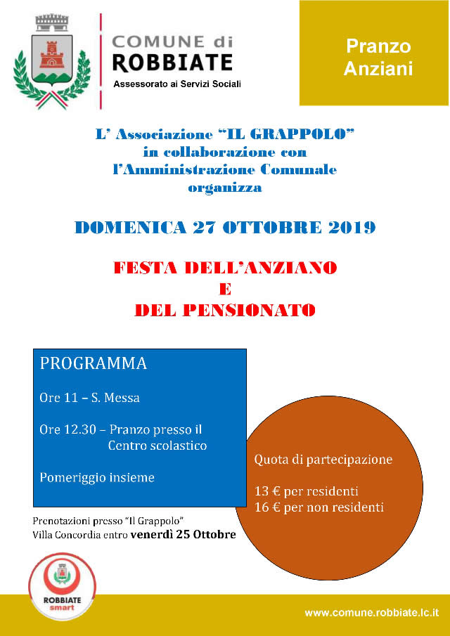L'associazione Il Grappolo organizza, in collaborazione con l'Amministrazione comunale, la festa dell'anziano e del pensionato che si svolgerà domenica 27 ottobre. Alle 11 messa e alle 12.30 pranzo presso il centro scolastico. Iscrizioni alla sede del sodalizio, in Villa Concordia, entro il 25 ottobre.