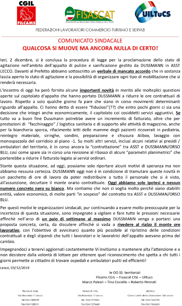 stato di agitazione degli addetti alla sanificazione delle strutture ospedaliere e degli ambulatori del lecchese, gestiti dall'ASST, è in vigore. Sindacati e operatori sono in attesa di essere convocati a giorni dall'azienda ospedaliera e dalla nuova società che gestisce il servizio,