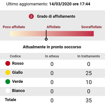 Continua incessante anche il lavoro del personale di pronto soccorso. In questi minuti il reparto è classificato "affollato" con 35 pazienti in trattamento di cui 25 in codice giallo e 10 in codice verde.