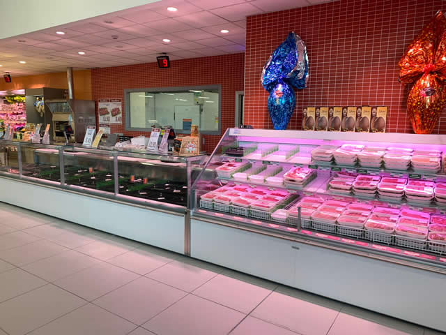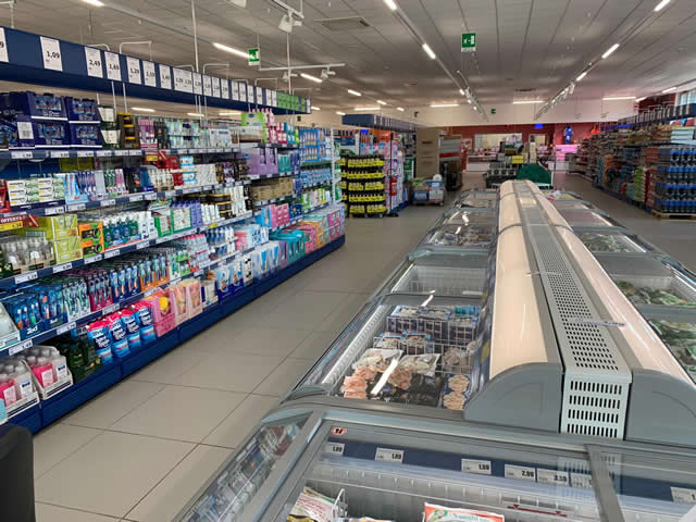 LUMINOSO: le ampie vetrate nel fronte principale del punto vendita invitano lo sguardo del cliente ad una immersione completa nello store, cogliendone immediatamente la profondità. Le corsie, simmetriche e perfettamente illuminate da impianti Led di ultima generazione, guidano lo sguardo sul versante opposto del punto vendita, dove si allineano il laboratorio del pane in doratura e i reparti rigorosamente serviti, della Gastronomia e della Macelleria.